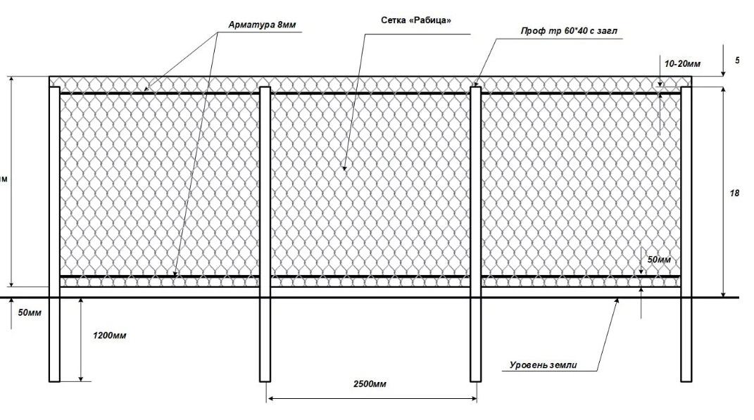 Конструкция забора из сетки-рабицы с протяжкой арматурой