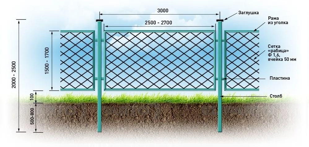 Конструкция секционного забора из сетки-рабицы